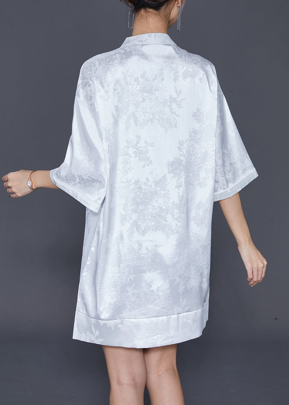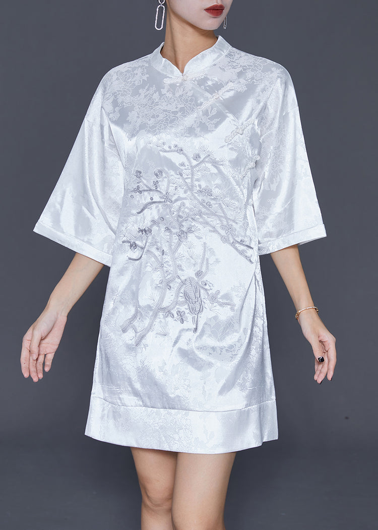 White Jacquard Silk Chinese Style Dress Embroideried Half Sleeve