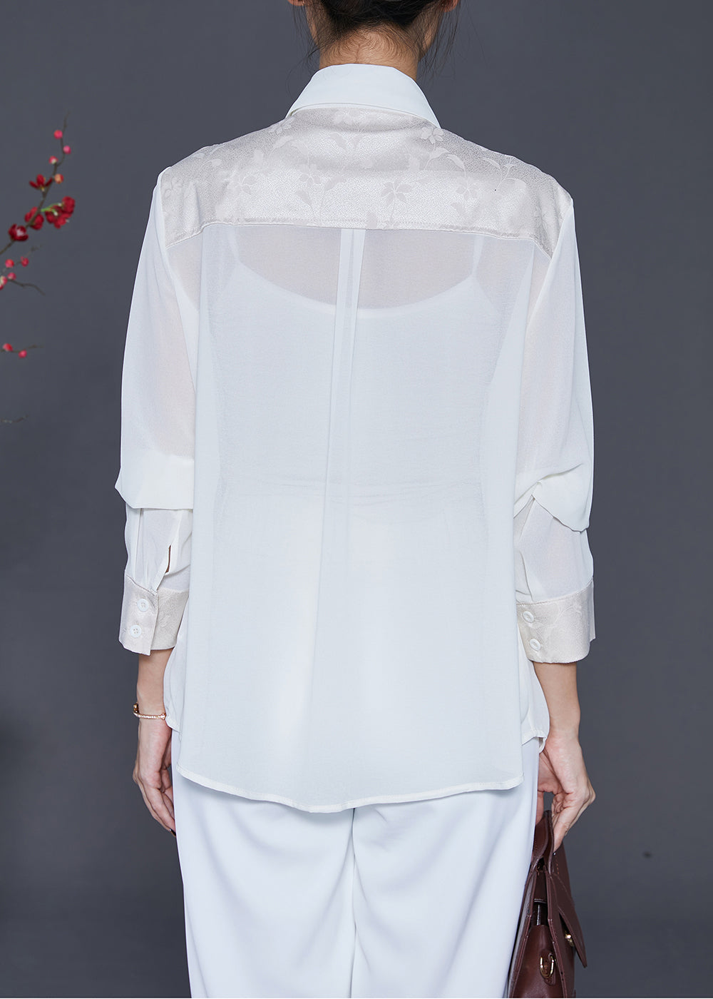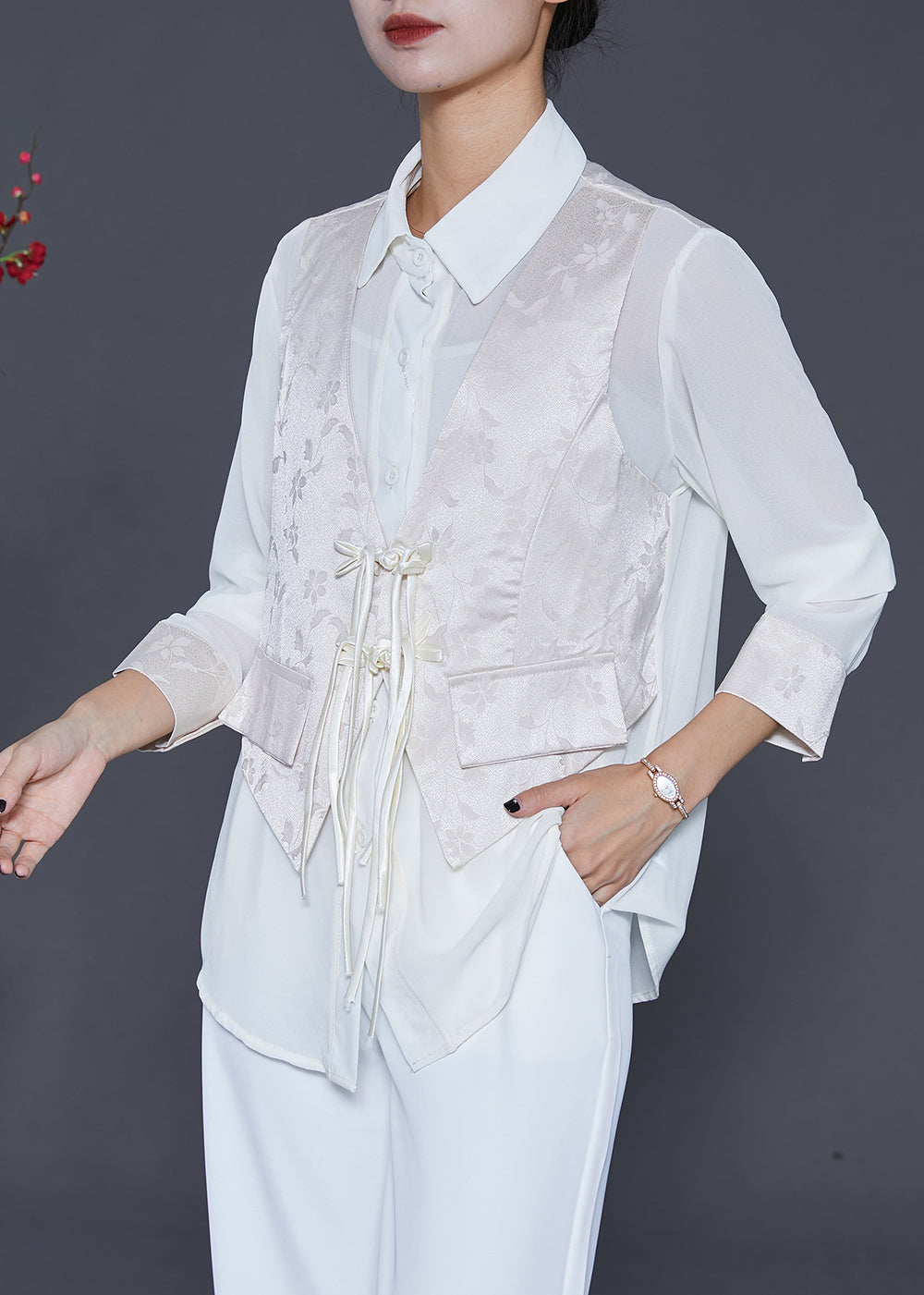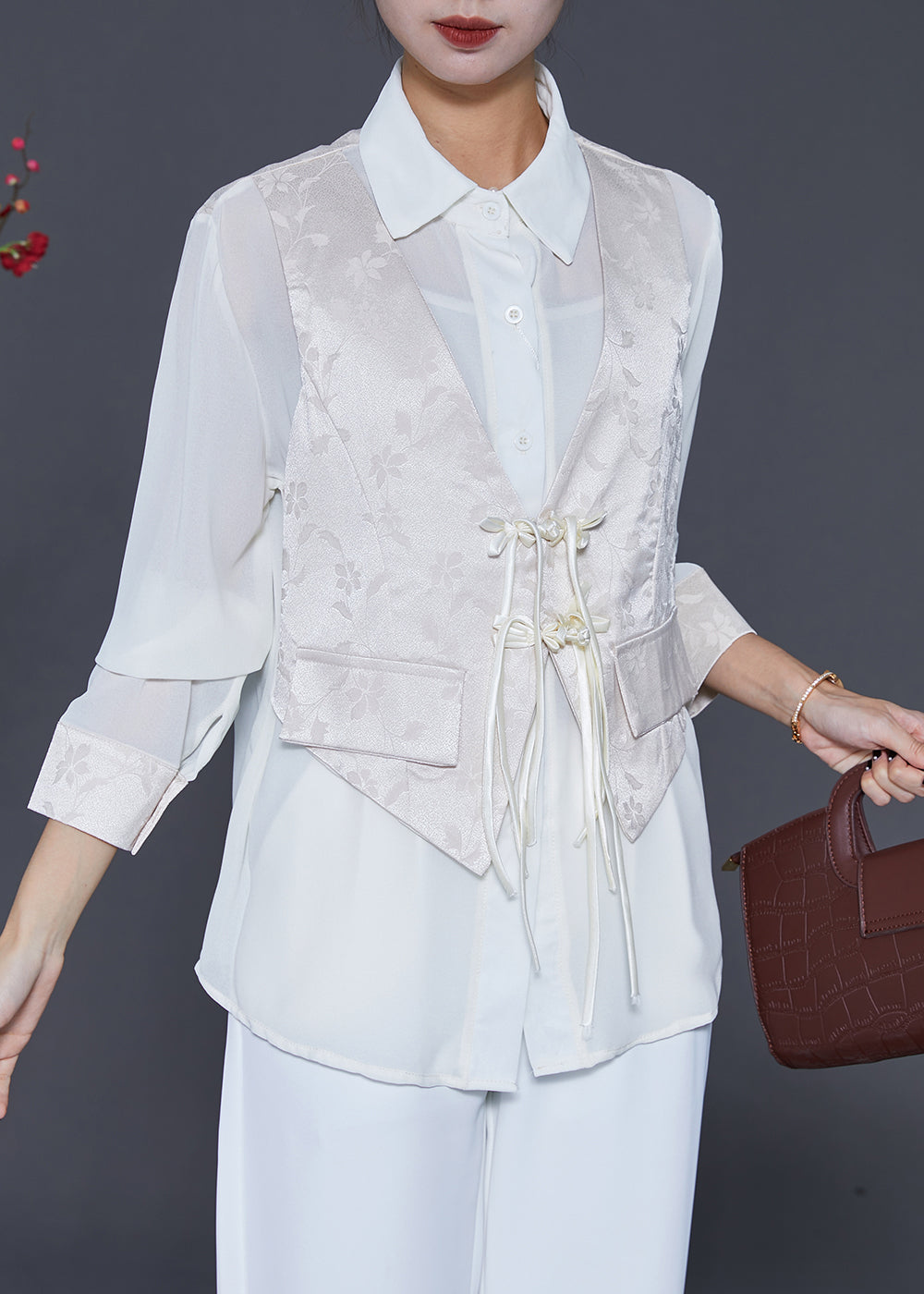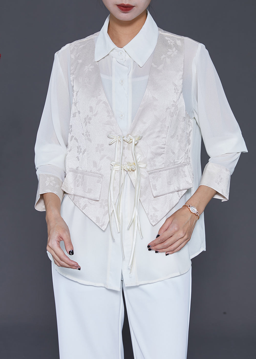 White Jacquard Silk Fake Two Piece Shirt Top Chinese Button Tasseled Fall