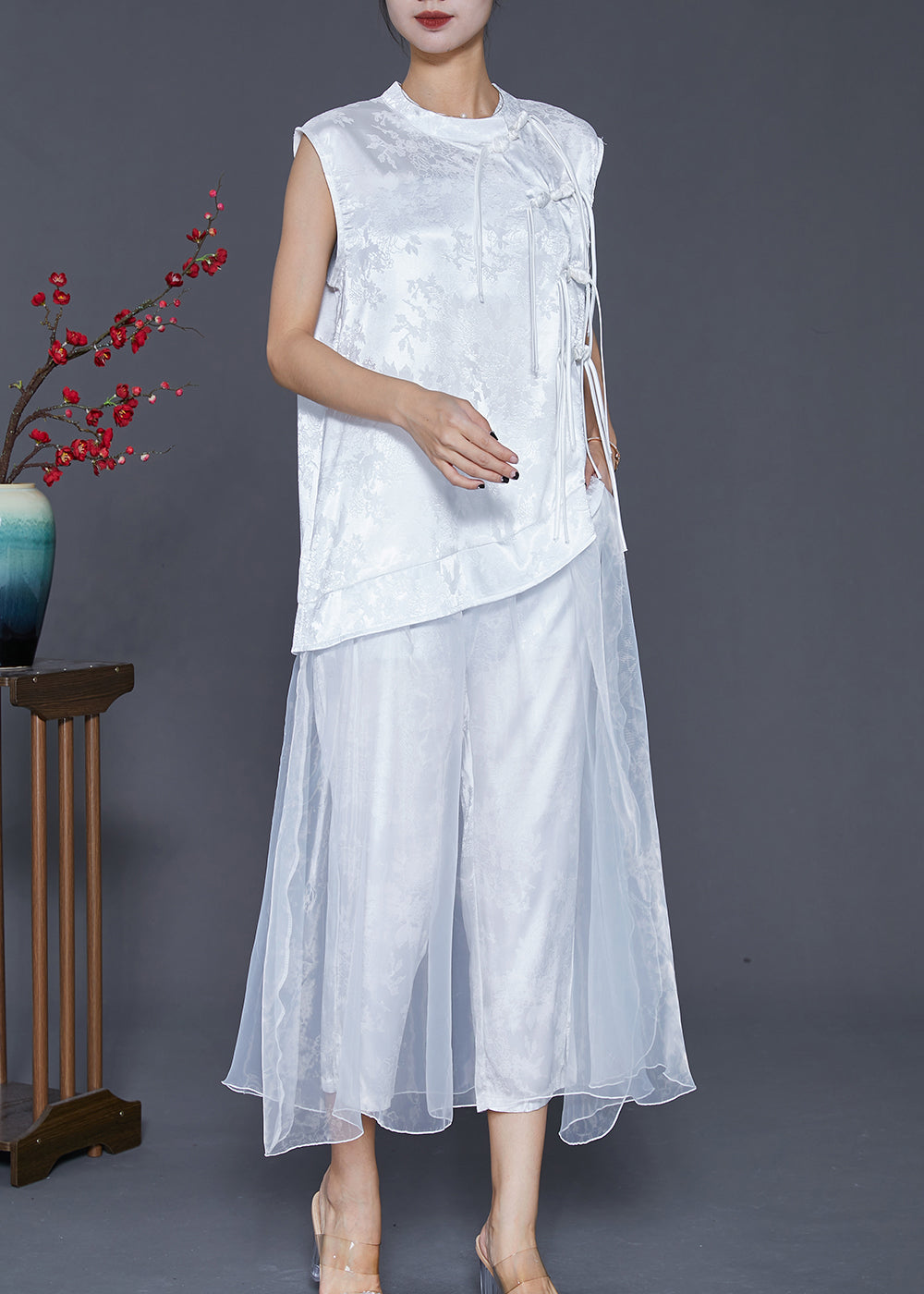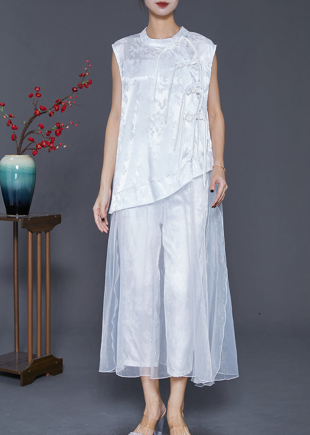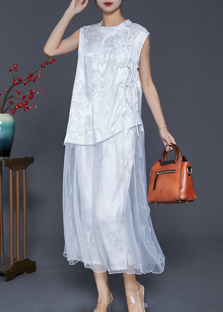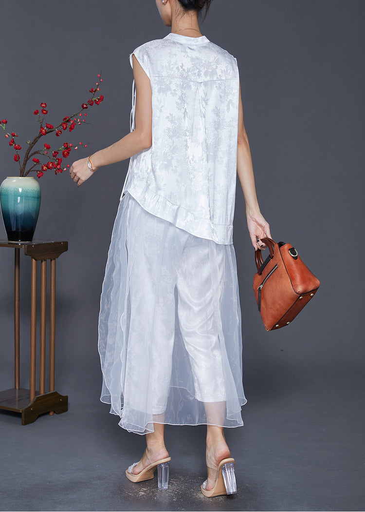 White Patchwork Silk Two Pieces Set Tasseled Jacquard Fall