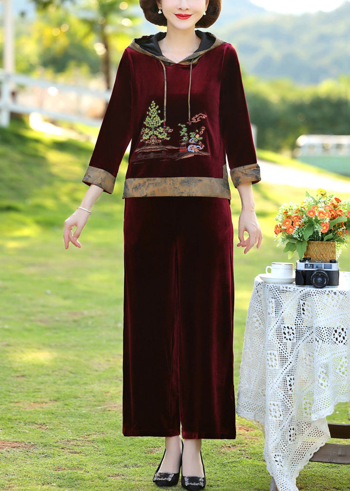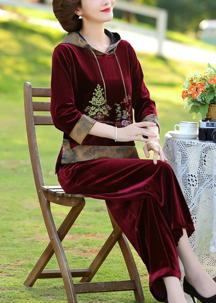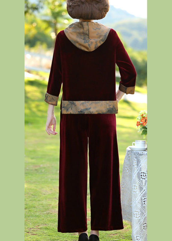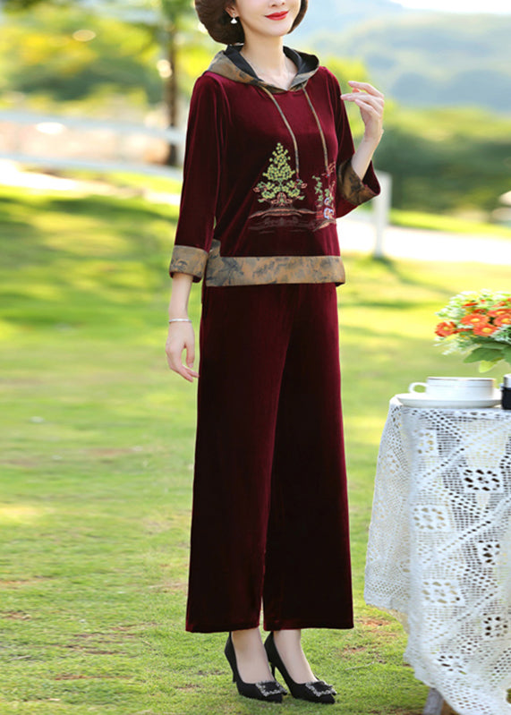 Wine Red Drawstring Silk Velour Pullover And Wide Leg Pants Two Pieces Set Long Sleeve