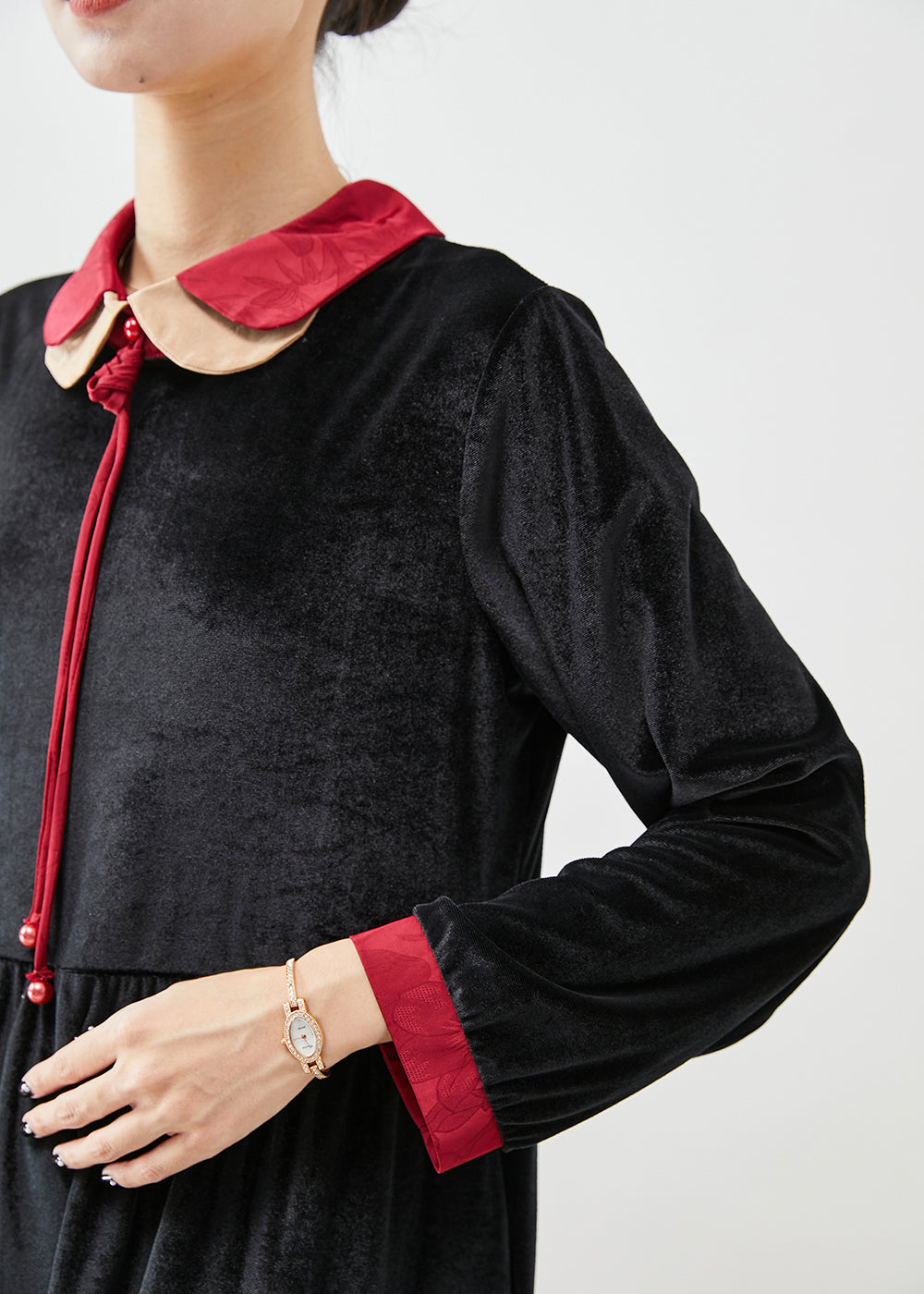 Women Black Double-layer Tasseled Silk Velour Dress Fall