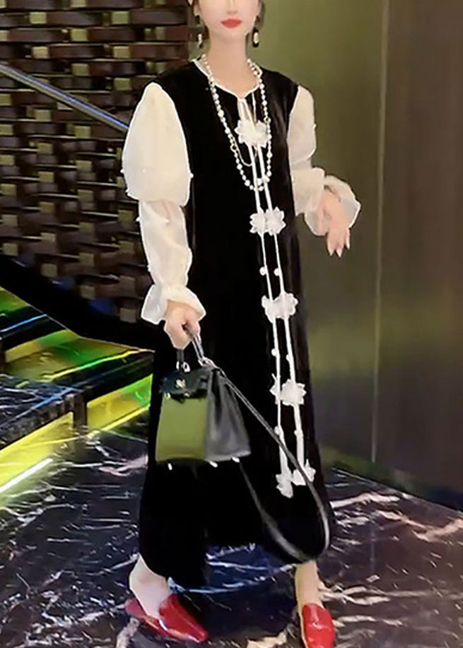 Women Black Nail Bead Patchwork Silk Velour Dresses Puff Sleeve