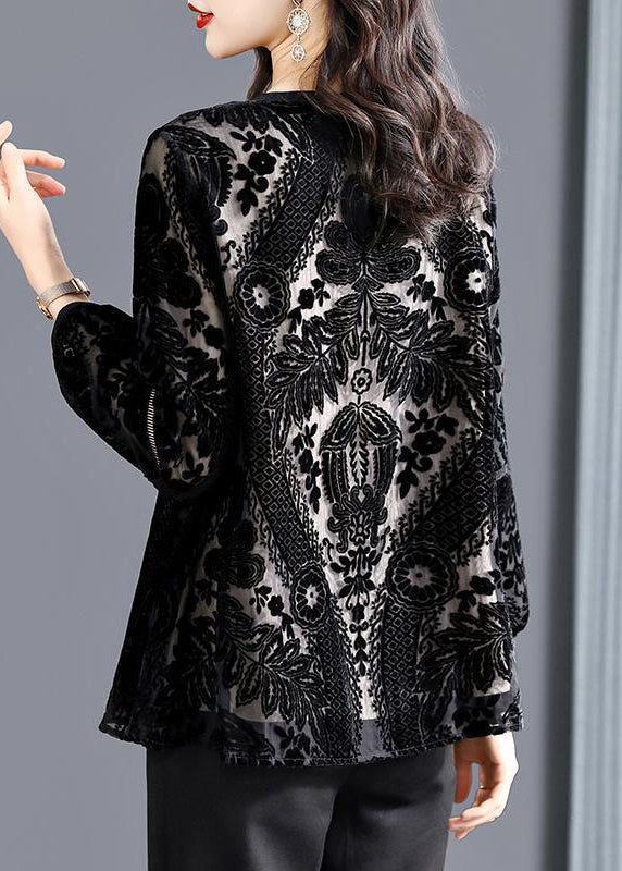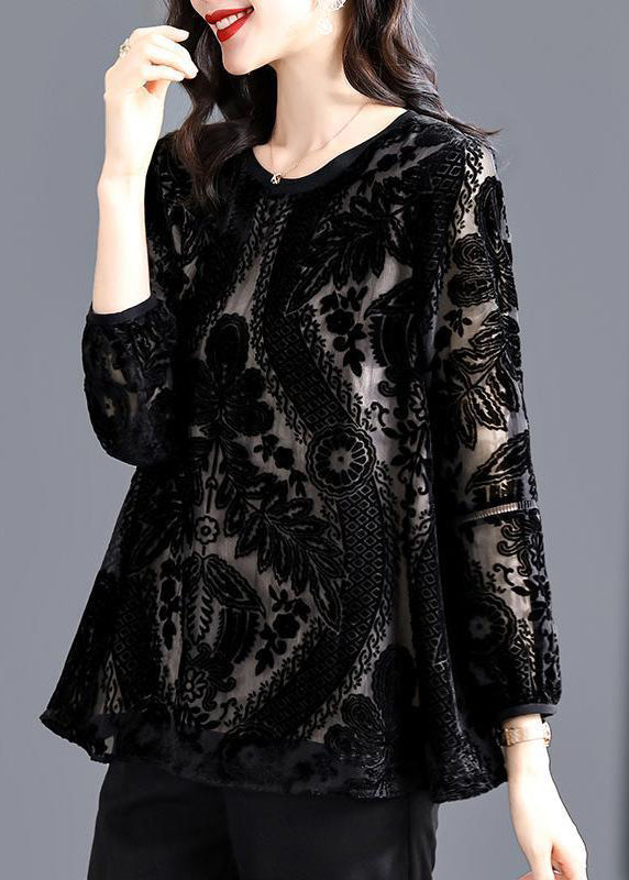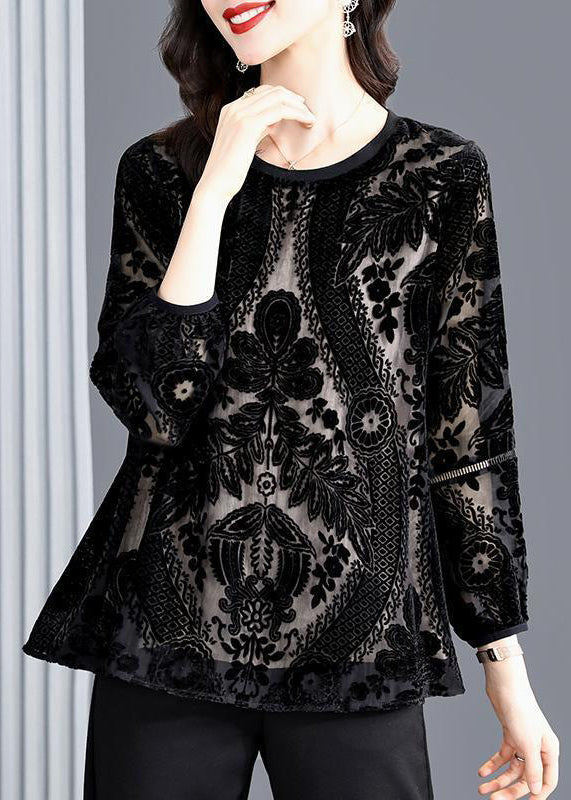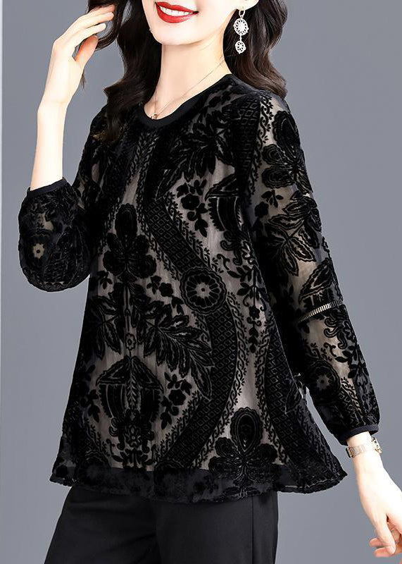 Women Black O-Neck Hollow Out Patchwork Silk Velour Top Fall