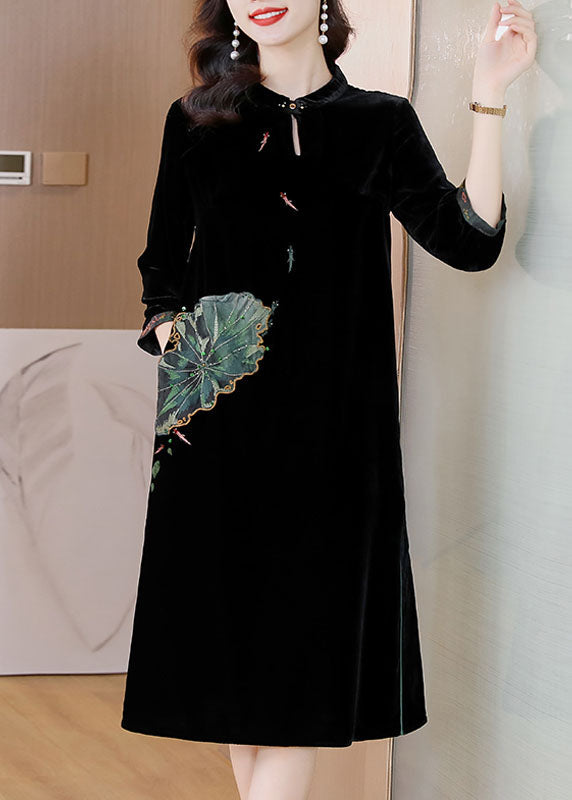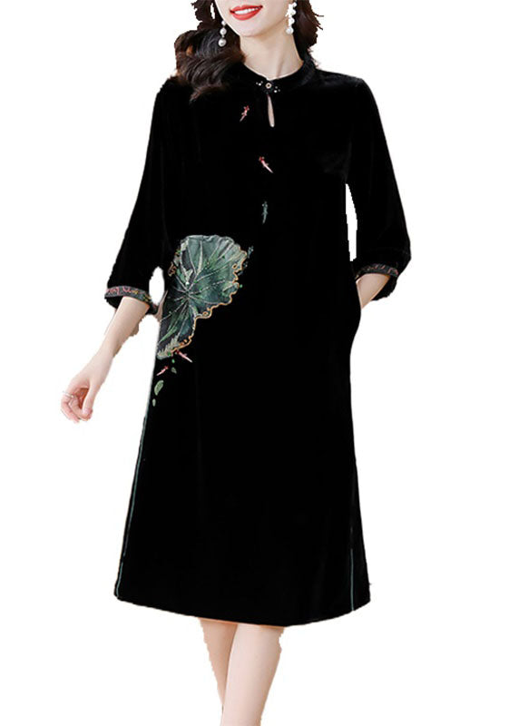 Women Black O-NeckPockets Button Silk Velour Long Dresses Bracelet Sleeve
