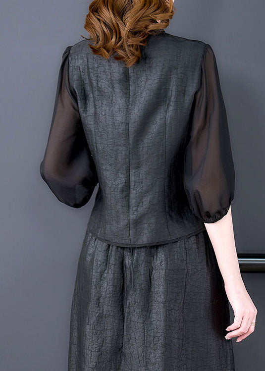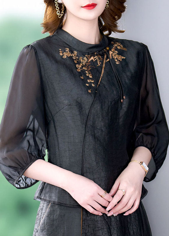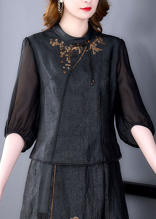 Women Black Tasseled Embroideried Patchwork Silk Top Summer