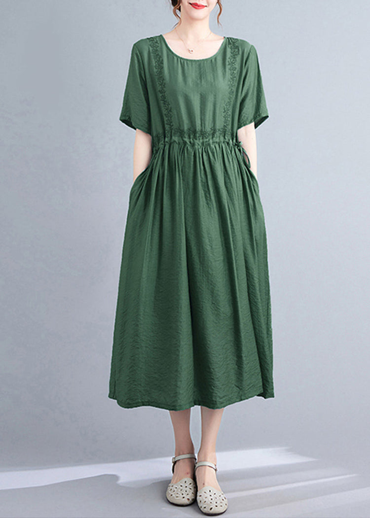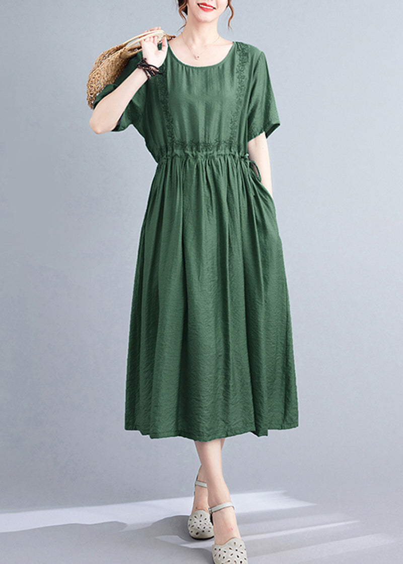 Women Blackish Green Embroideried Cinched Linen Silk Dress Summer