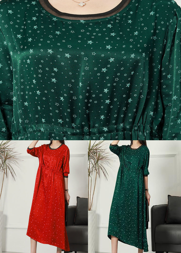 Women Green O Neck Print Patchwork Thin Silk Dresses Spring