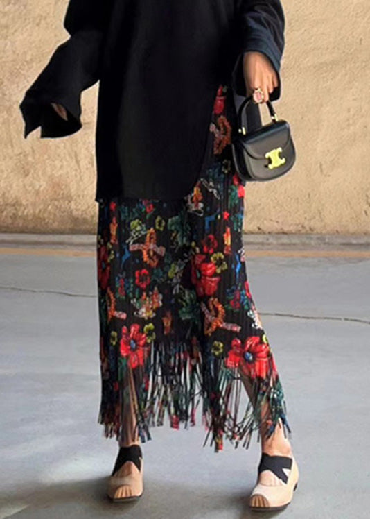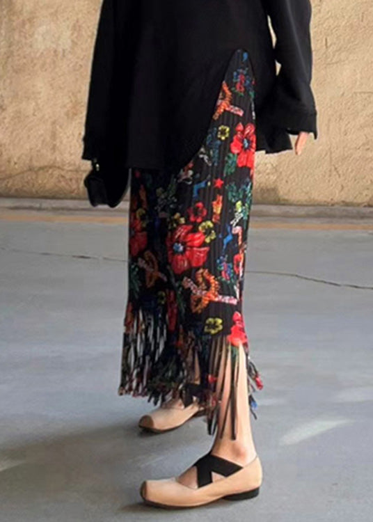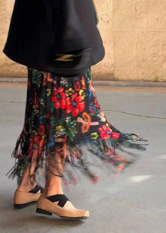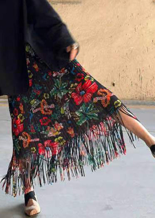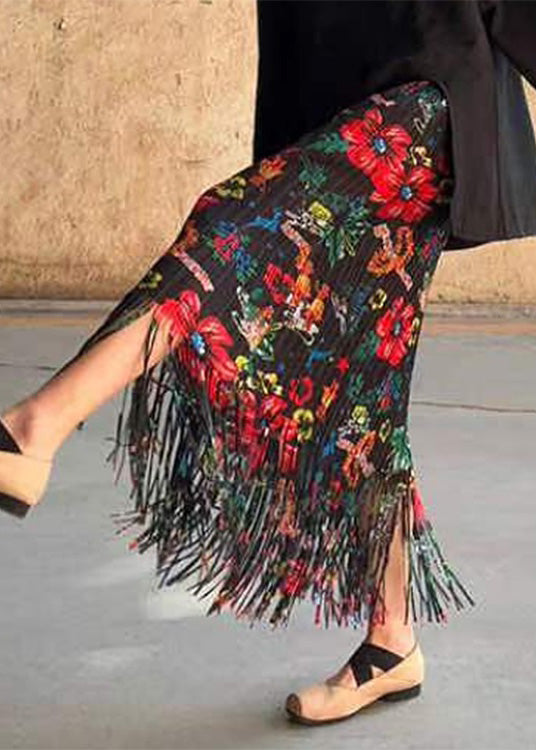 Women Red Print High Waist Tassel Silk A Line Skirts Summer