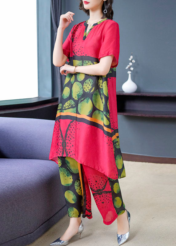 Women Red Print Tops And Pants Silk Two Pieces Set Summer