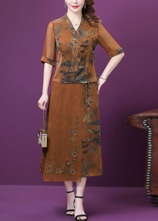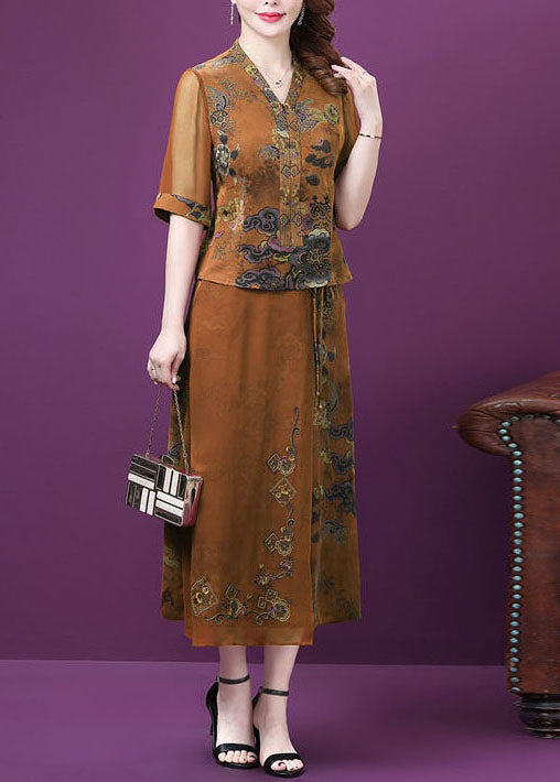 Women Yellow V Neck Tasseled Print Patchwork Silk Two Pieces Set Summer