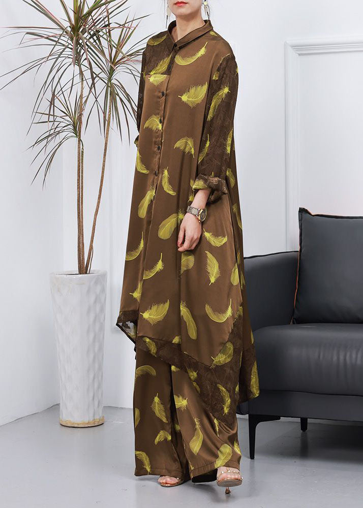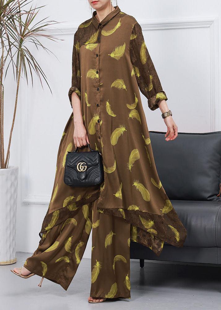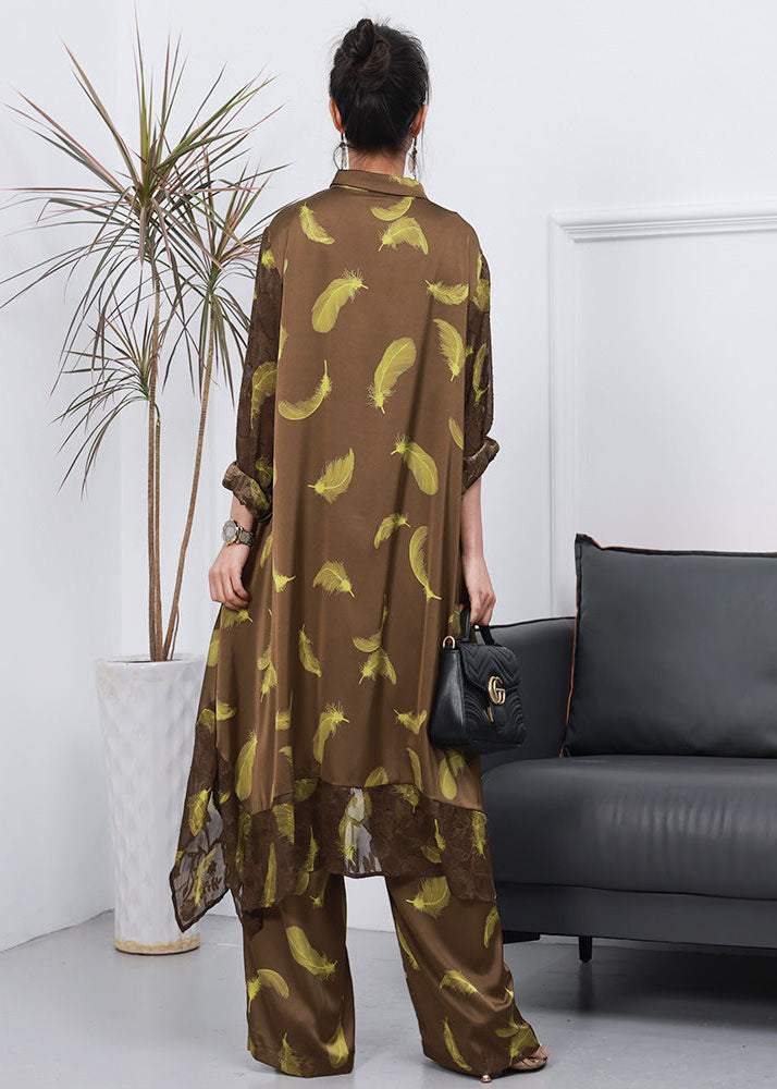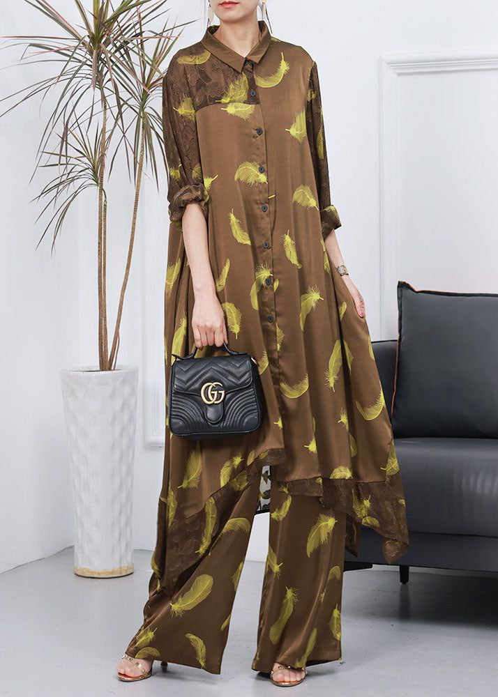 Yellow Print Patchwork Silk Two Pieces Set Wrinkled Asymmetrical Spring