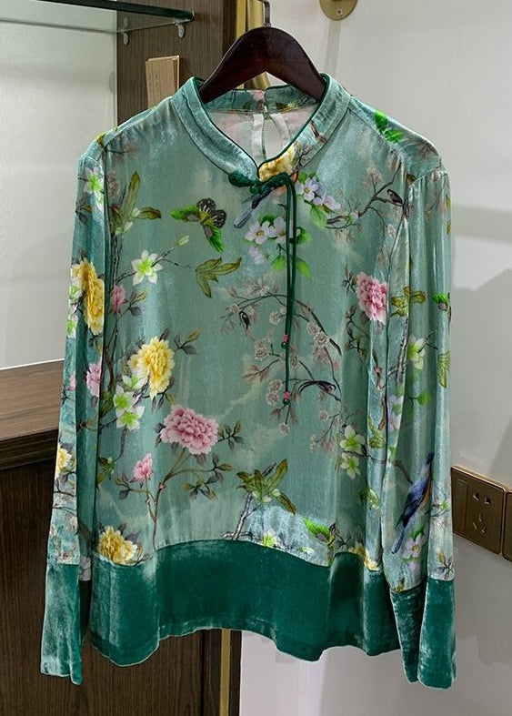 Chinese Style Green Button Print Patchwork Silk Velour Shirts Fall