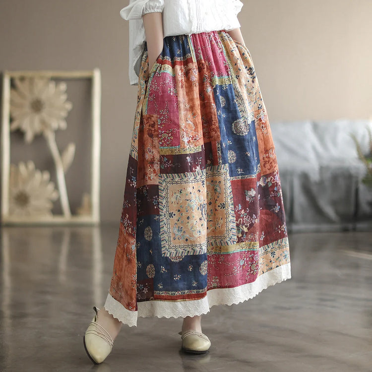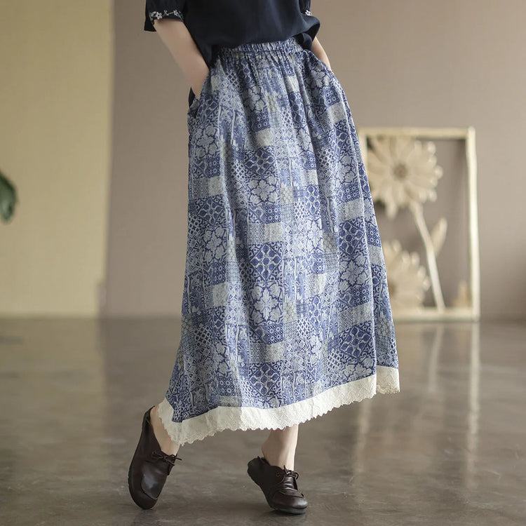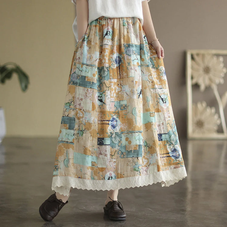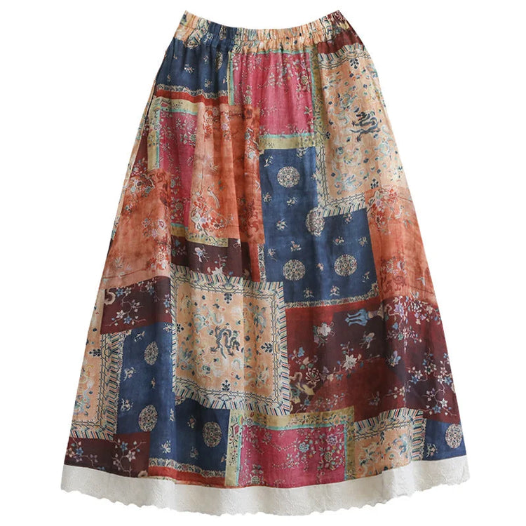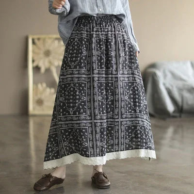 Retro Linen Print Cozy Loose Plus Size A-Line Trimmed Skirt