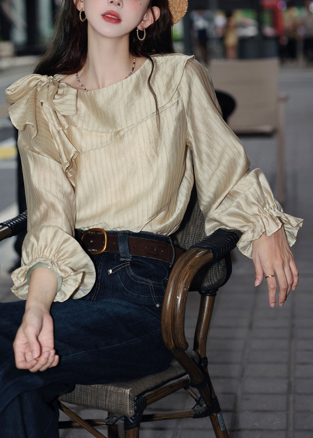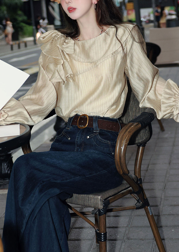Slim Fit Apricot Striped Lace Up Cotton Blouses Butterfly Sleeve