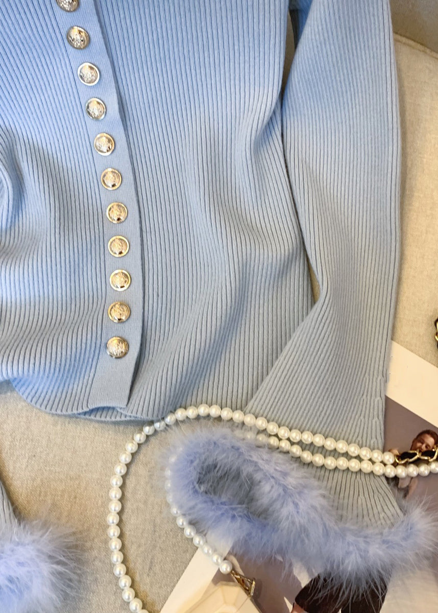 Slim Fit Black Button Patchwork Knit Sweater Flare Sleeve