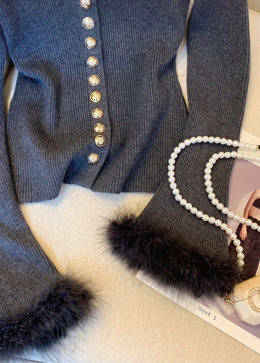 Slim Fit Dark Gray Fluffy Solid Patchwork Knit Sweater Flare Sleeve