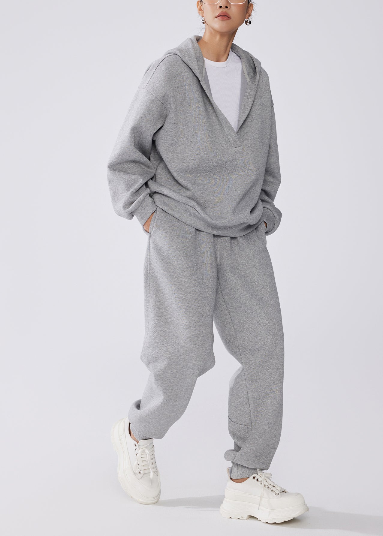 Loose Grey Hooded Sweatshirt And Pants Warm Fleece Two Pieces Set Winter
