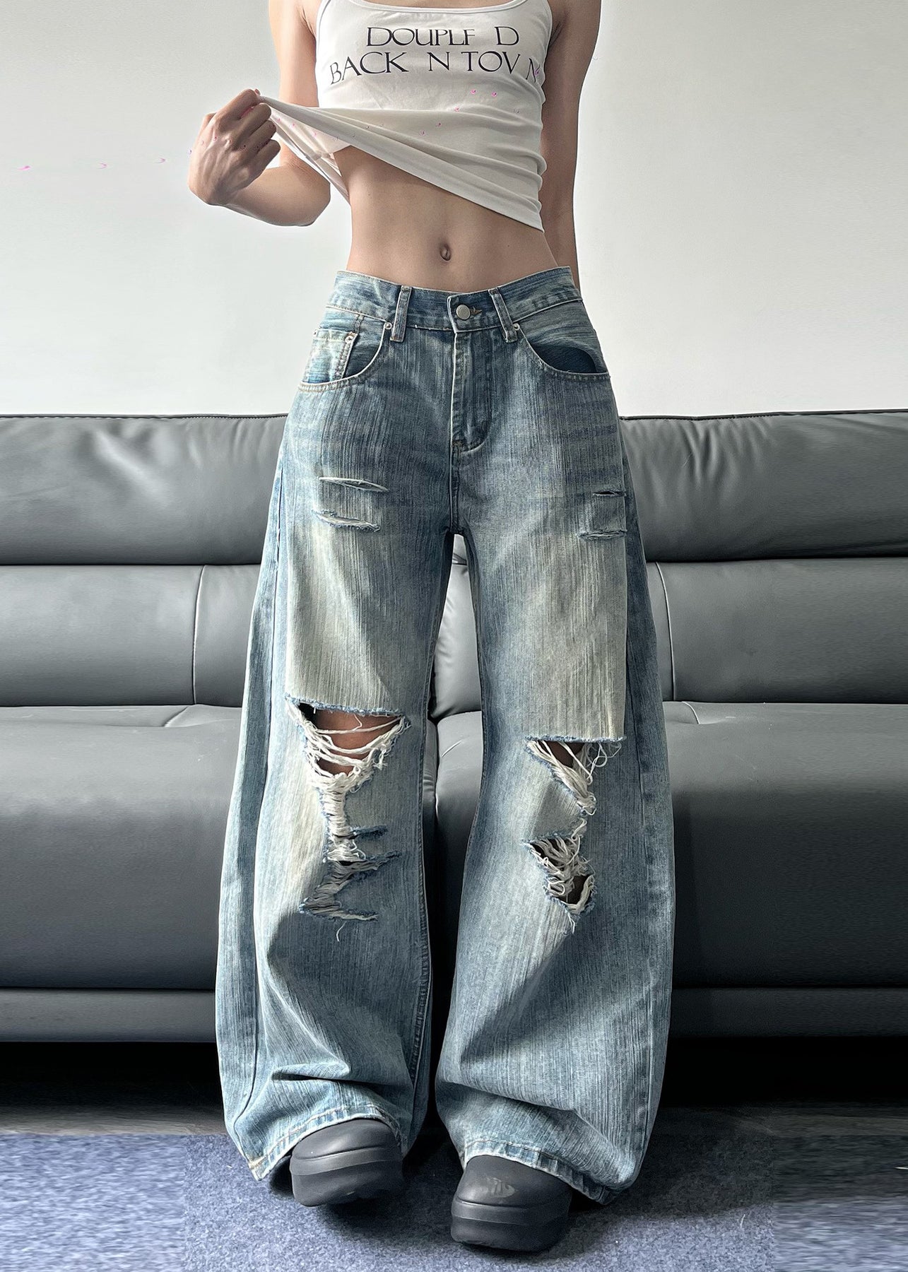 American Style Blue Pockets Denim Ripped Wide Leg Pants Fall