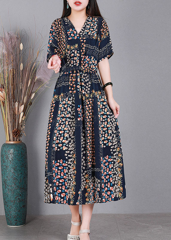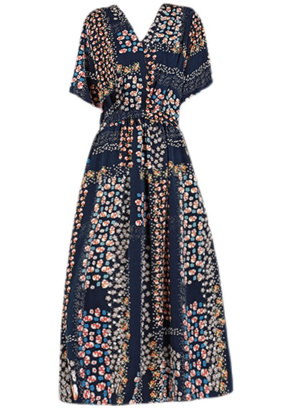 Bohemian Navy V Neck Print Drawstring Silk Long Dress Short Sleeve