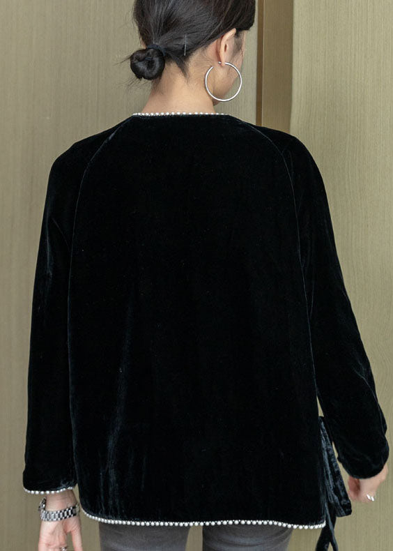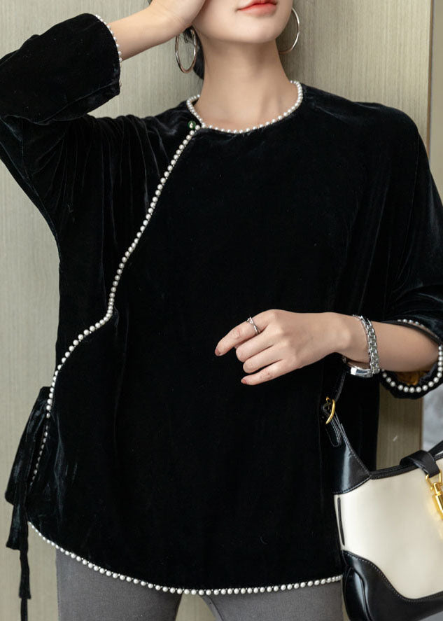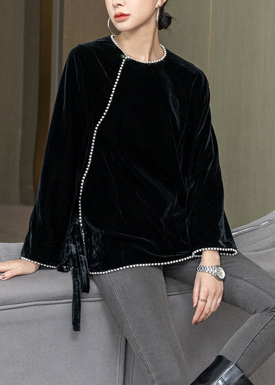 Boutique Black O Neck Nail Bead Lace Up Silk Velour Top Spring