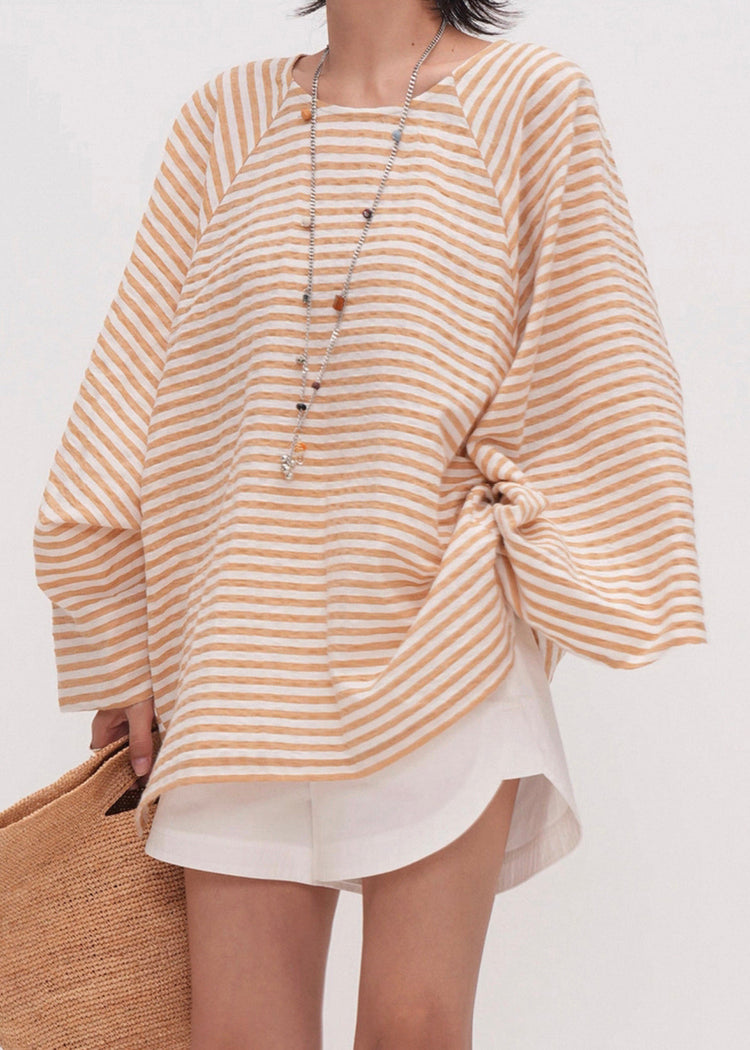 Striped Orange O Neck Oversized Cotton T Shirts Batwing Sleeve